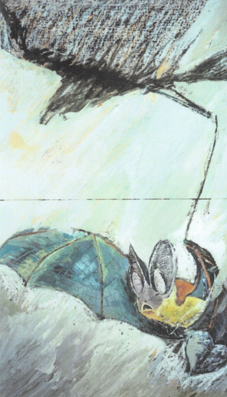 Wie vor sich selbst erschreckt, durchzuckts die Luft, wie wennein Sprung durch eine Tasse geht. So reißt die Spur derFledermaus durch Porzellan des Abends.(8. Elegie) Mischtechnikauf Holz 65 x 110 cm