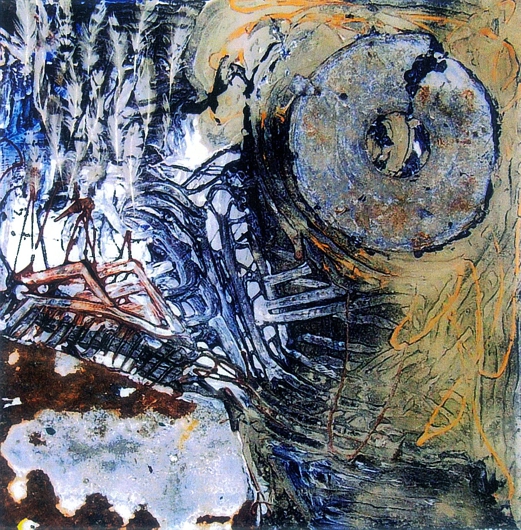 Winterreise - Ein zerbrochener Ring 80x80 cm, Acryl, Sand. Fundstücke auf Holz (Assemblage)