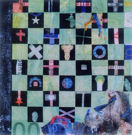 Winterreise - Die Kammern all besetzt, 90x90 cm, Acryl, Collage, Fundstück auf Holz, 2006